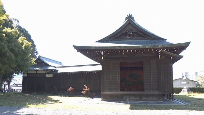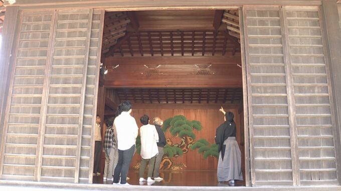 山口市の野田神社にある能楽堂を地元の人などが訪れ、山口鷺流狂言保存会の解説を聞きながら見学しました。