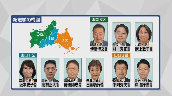 今回の衆院選からは、「一票の格差」是正を目的とした区割りの変更により、県内の小選挙区は4から3に減り、合わせて9人が立候補しています。