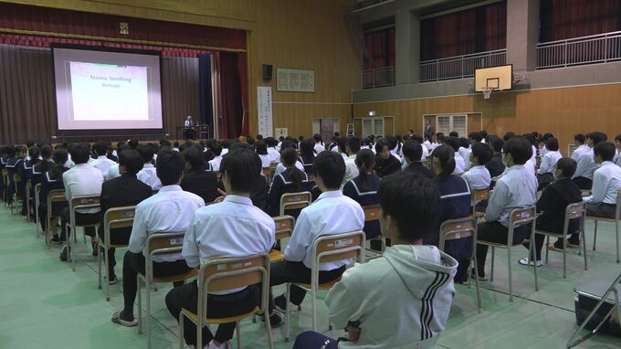 箕牧さんは中学生らおよそ200人を前に、3歳の時に被爆した自身の体験を交えて、爆風で家が倒れる光景や被爆した人々の状況を語り、核廃絶を訴えました。