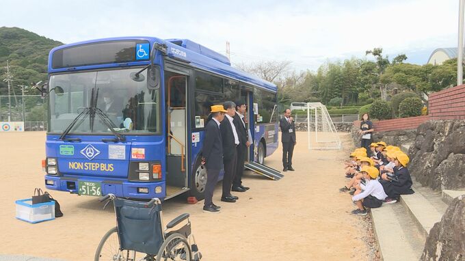 2年生21人が、スロープ付きのノンステップバスは段差がなく車いすのまま乗れることや、ドアが開いているときはインターホンを押して運転手と会話できることなどを学びました。