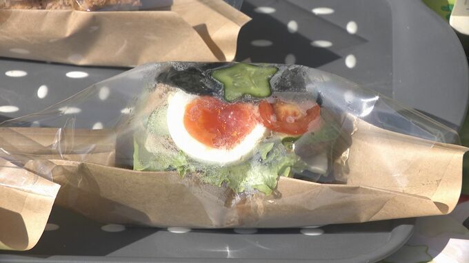 会場には、秋吉台の石灰岩を形づくる絶滅動物、フズリナの化石の塗り絵を缶バッジにできるブースのほか弁天池でとれたマスを使った「ますバーガー」など、地元グルメも並びました。