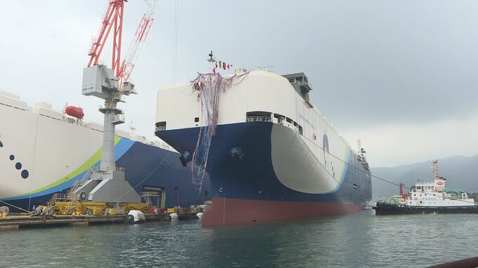 重油の代わりに液化天然ガスを燃料とし、二酸化炭素の排出量を抑えた自動車運搬船の進水式が山口県下関市の造船所でありました。