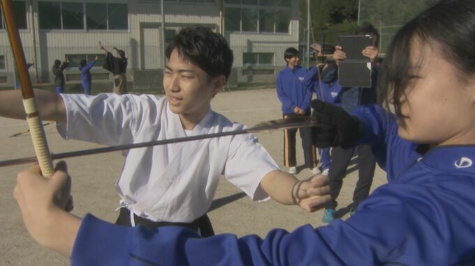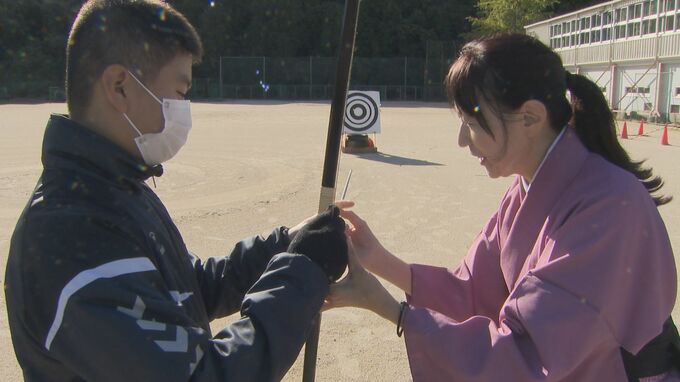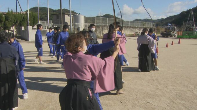 講師は光市弓道連盟の6人で、生徒たちは学年別に分かれて、一人一人が礼儀作法や弓のひき方などを教わりました。