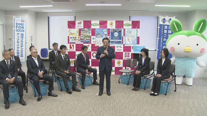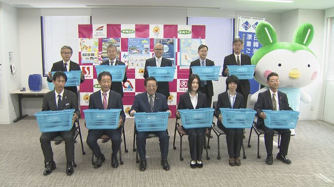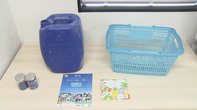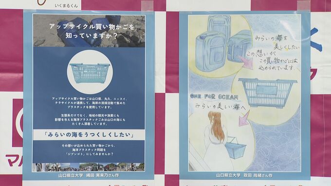 スーパーを展開する丸久が企業や山口県などとともに、海岸清掃で集めた漂着ポリタンクを買い物かごに再生しました。
