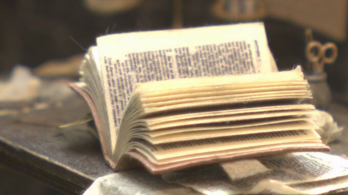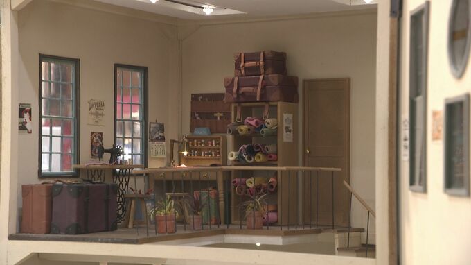 旅行用のトランクが並ぶ革製品のお店のようにみえますが、実はすべて12分の1サイズのミニチュアなんです。