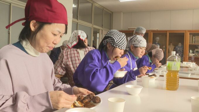 長門市の日置中学校の1年生14人が、地域の女性グループと一緒にクジラ肉を使ったカツカレー作りに挑戦しました。