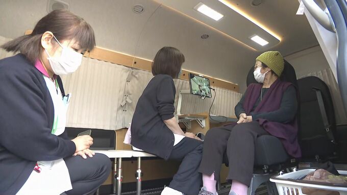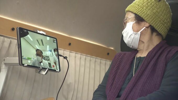 車両内で、看護師が体温や血圧などをはかったあと、主治医とオンラインで結んで健康状況や薬について確認していました。