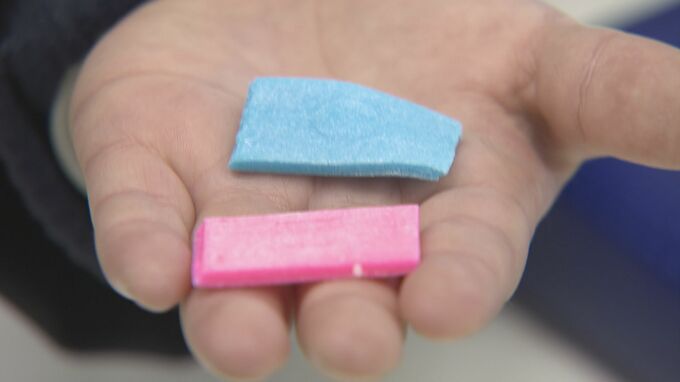 この日は赤と青の2色のガムをかんで、色の混ざり具合で分かるかむ力の測定も行われました。