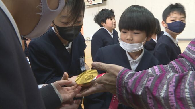 4年生の児童を前に、金メダルをとった気持ちや夢を実現するための方法などを話しました。