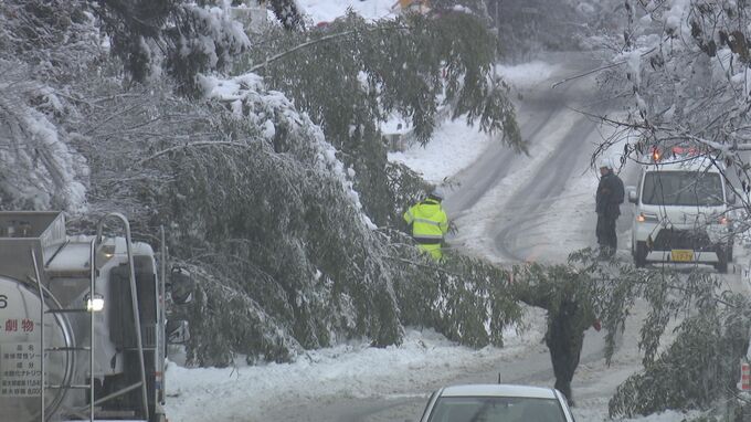 午前8時の時点で16センチの積雪が観測された山口市の阿東徳佐地域では、雪の重さで倒れたとみられる木が道路を塞いでいる様子が確認できました。