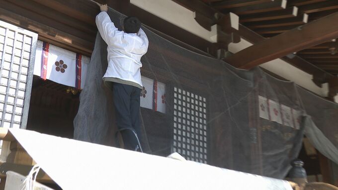 防府天満宮ではさい銭箱を広げたり、投げ込まれたさい銭が境内に入らないようネットを設置したりするなど、新年の準備が進められています。