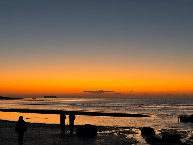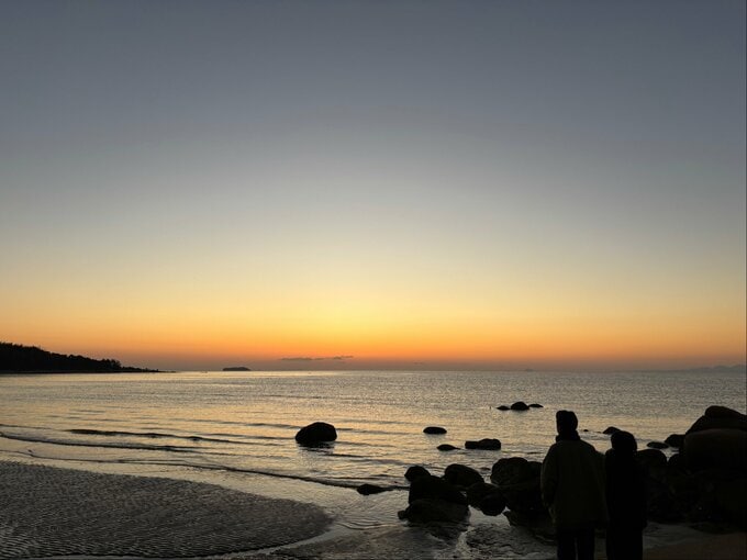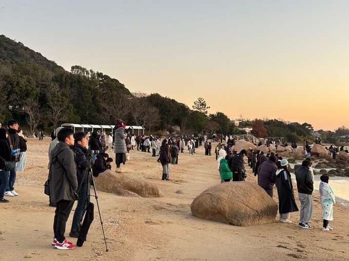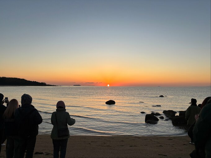 この場所は、干潮時に水面が鏡のように周囲の風景を映す、撮影の人気スポットでもあり、多くの人が初日の出を拝みに訪れました。