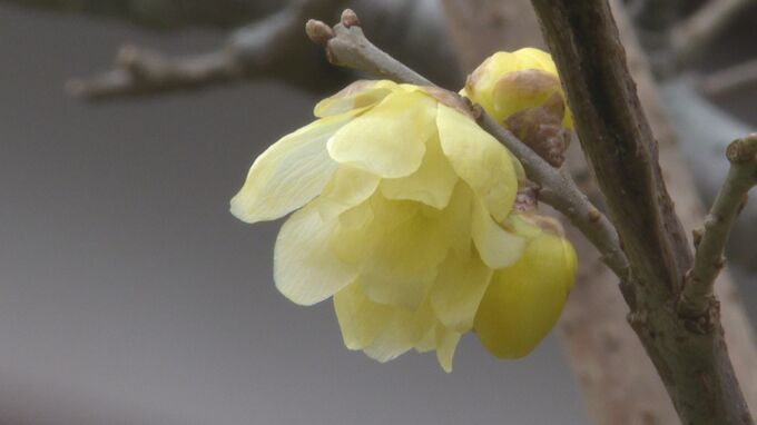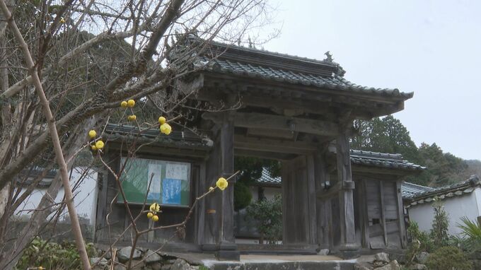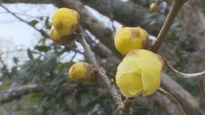 山口県萩市の寺の境内で冬の花、ロウバイが咲き始めています。