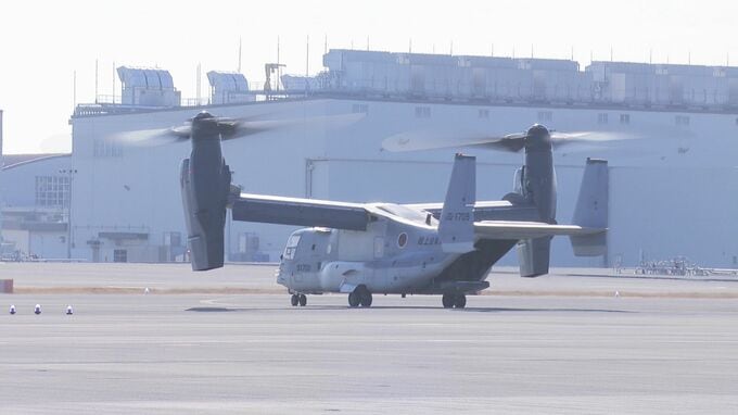 「呉から運ばれた救援物資が陸上自衛隊のオスプレイに積み込まれます。被害がひどかった地域にオスプレイで運ばれます」