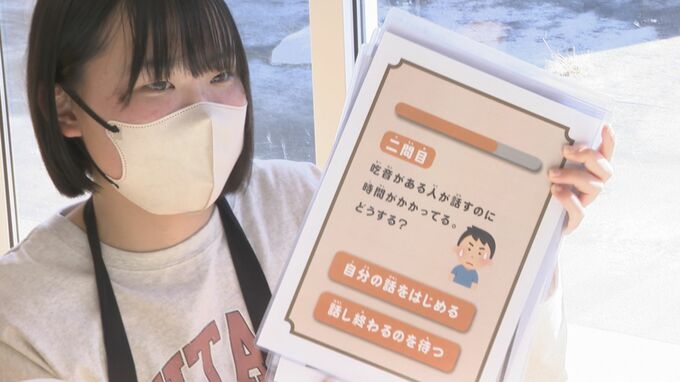 「2問目です。きつ音がある人が話すのに時間がかかっています。どうしますか?(1)自分の話を始める(2)話し終わるのを待つ」