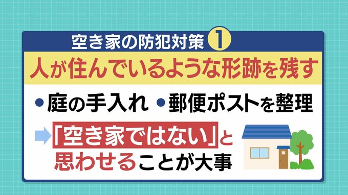 ほかには窓ガラスを割れにくいものに変える、定期的に訪れて近所の人とコミュニケーションを取り、不審なことがあれば連絡してもらえる関係を築くことも被害防止につながります。