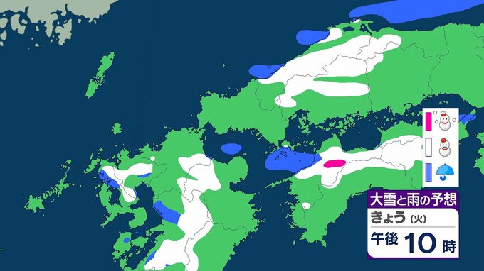 このため、九州北部地方の山地では29日夜のはじめ頃にかけて、平地では28日夜遅くから29日昼過ぎにかけて大雪となるおそれがあります。