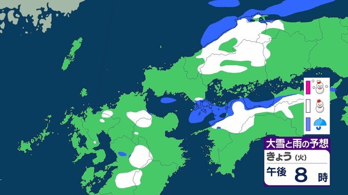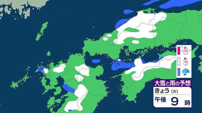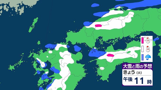 九州北部地方の山地では29日夜のはじめ頃にかけて、平地では28日夜遅くから29日昼過ぎにかけて大雪に注意してください。