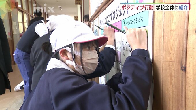そばの掲示板には児童たちの手書きメッセージ。自分や友だちのポジティブな行動が書かれています。