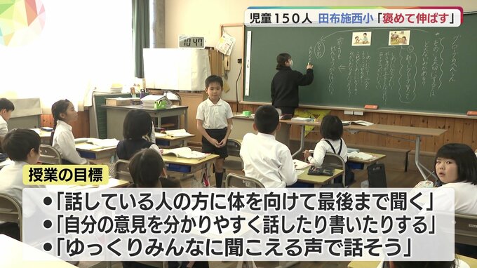 授業での目標は「話している人の方に体を向けて最後まで聞く」「自分の意見をわかりやすく話したり書いたりする」「ゆっくりみんなに聞こえる声で話そう」の3つをかかげています。