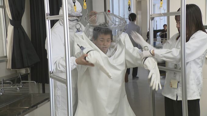 児童は、本物の注射器を使った接種体験や、微生物を持ち込まないように工場で着る、ハーフスーツと呼ばれる作業着を試着して医療用の道具について学びました。