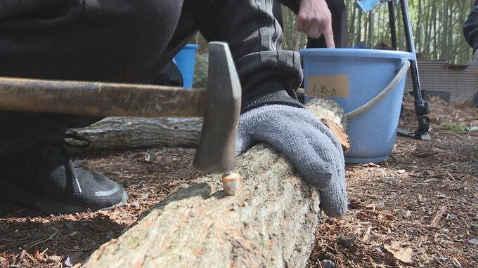 山口県阿武町の小学校で10日、児童がシイタケの菌を植え付ける「原木シイタケ」作りを体験しました。