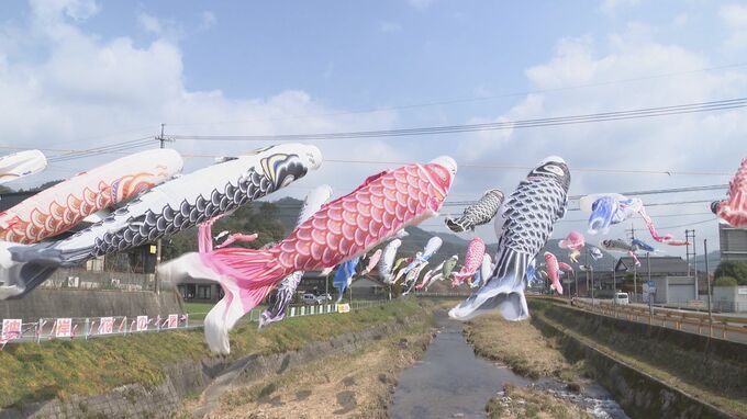 「およそ130匹のこいのぼりがことしも仁保川の上空を泳いでいます」