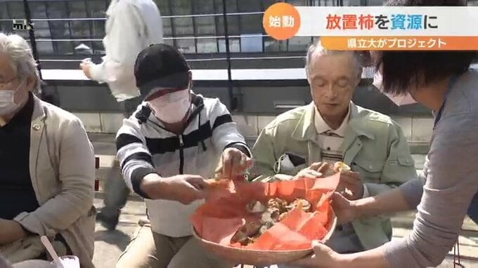 プロジェクトに携わったおよそ20人が県立大に集まりました。加工品の試食会です。秋川牧園からは柿とヨーグルトを混ぜて作ったジェラートとバゲットにも合うソース。木原製作所からはじっくり低温で乾燥させた2種類のドライフルーツが持ち込まれました。収穫でお世話になった仁保地域の人たちと試食します。