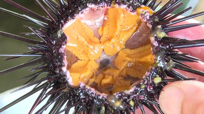 鮮やかな色の身がぎっしりと詰まっています。キャベツの葉を餌にしたムラサキウニです。