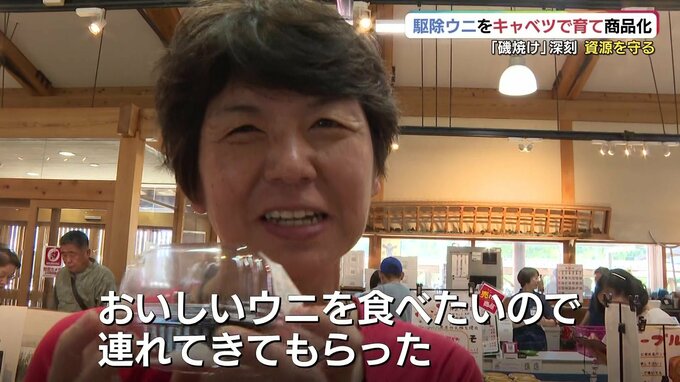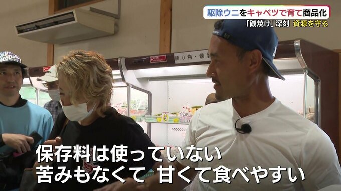 「保存料、使ってないんで、苦みもなくて甘くて食べやすいんですよ。キャベツ食べてますこのウニ」
