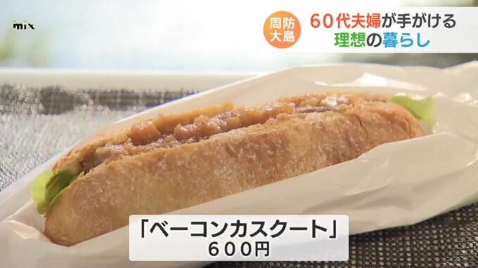 グルメも充実しています。こちらは人気メニューの1つ、フランスパンに自家製ベーコンと新鮮な野菜を挟んだベーコンカスクート(600円)です。