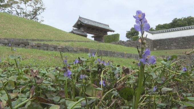 山口県萩市の観光スポット「北の総門」そばの堀で、ミズアオイの花が見頃を迎えています。