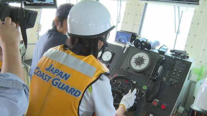 海上パトロールに使われている巡視艇「にじかぜ」に乗り、職員から海図の読み方や、レーダーの見方などの説明を受けました。実際にハンドルを持って船のかじ取りも体験しました。