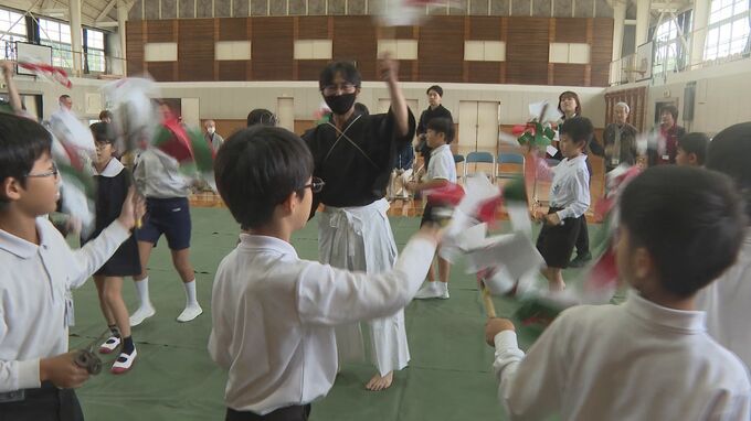 このあと、児童たちは自分たちで作った御幣や鈴を手に、神楽独特のリズムを取りながら基本の舞を体験しました。