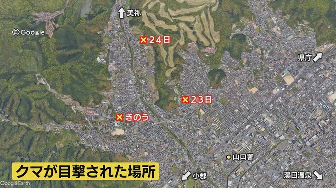 26日午後5時ごろ、山口市吉敷佐畑の良城小学校の近くを車で通りかかった70代の女性から「クマがいる」と警察に通報がありました。クマは、体長およそ1メートル。24日と25日も、1キロから1.2キロ離れた場所でクマが目撃された情報があったばかりです。