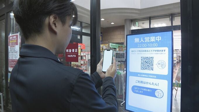 無人営業時間帯は、入り口に設置されたQRコードを読み取り、LINEで友達追加をすると入店することができます。入店時の認証のほか、防犯カメラの個数を増やして防犯対策を行っています。