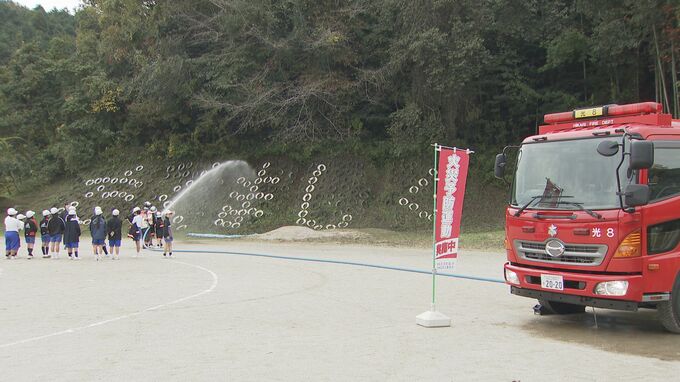 秋の火災予防運動にあわせた防火活動です。山口県光市の大和小学校で13日、児童が消防車を使った放水体験などをして防火について学びました。