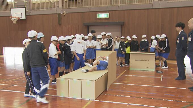 はじめに体育館で児童たちは、災害のときに使う簡易トイレと段ボールでつくるベッドの組み立てかたを見学しました。