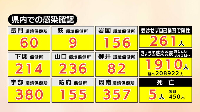 感染者の保健所別は、宇部で380人、周南で357人、山口で236人、下関で214人、岩国で156人などです。自己検査で陽性となり、フォローアップセンターに登録した人は261人です。