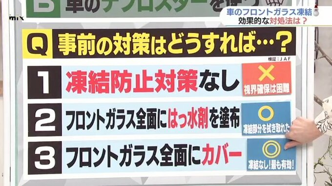 JAFの実験によると解凍剤を使った場合、1分ほどの短時間でフロントガラスの凍結を完全に溶かすことができたのに対し、車のエアコンをガラスに吹き付ける機能(デフロスター)を使った場合、視界が確保できるまで10分ほどかかりました。