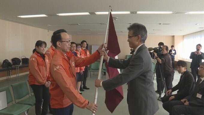 結団式では、中谷信夫団長に団旗が手渡され、「建築配管」競技に出場する三澤亮太)選手が、「県の代表として全力を尽くす」と意気込みました。