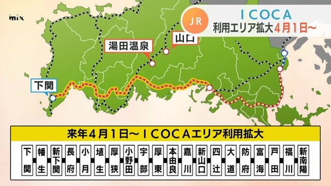 現在県内で利用できるのは、和木駅から徳山駅までの山陽線の区間となっています。来年4月1日からは、山陽線の下関駅までの区間と、山口線の湯田温泉駅と山口駅の、合わせて新たに22の駅でも利用を開始すると発表しました。