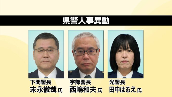 【全発表掲載】山口県警人事異動情報2026 規模は延べ1479人 トクリュウ対策「匿名・流動型犯罪対策官」新設 2026年2月27日(金) 15:00 国内 山口県警は27日、春の人事異動を発表しました。異動の規模は延べ1479人で、前の年より102人少なくなりました。 SNSで犯罪の実行役を集めるトクリュウの対策として「匿名・流動型犯罪対策官」を新設します。うそ電話詐欺や強盗など幅広い分野の捜査の指揮を担当するということです。 発表された人事異動の名簿は、次の通りです。< >は旧所属となります。 【警視正】【警視】【警部】【警部補】【職員】 ※新(旧)名前で掲載しています。環境により漢字が正しく表示されない場合があります。ご了承ください。