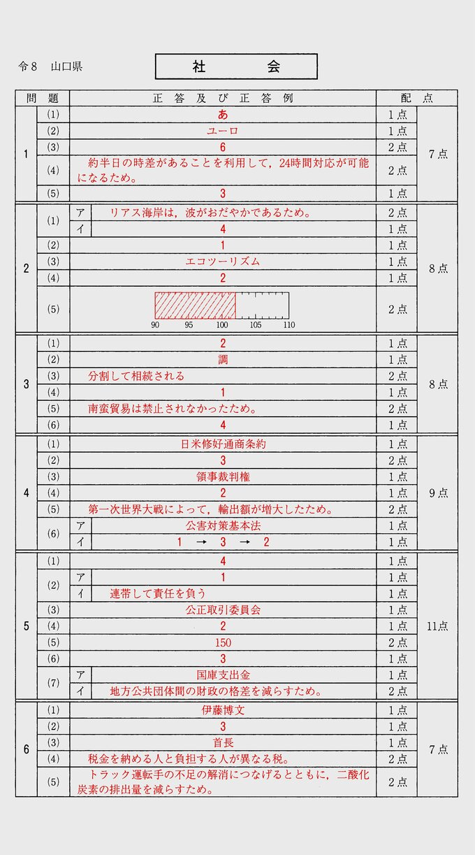 山口県公立高校入試『社会』試験問題・解答(令和8年度・2026年度) 2026年3月5日(木) 16:30 国内 解答 ●各科目の試験問題・解答は、次のリンクから見ることができます。 【国語】【数学】【英語】【社会】【理科】