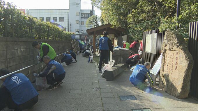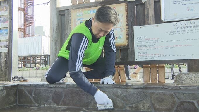 4日から山口市で始まる「湯田温泉白狐まつり」を前に、NTT西日本グループの社員などが温泉街の足湯を掃除しました。