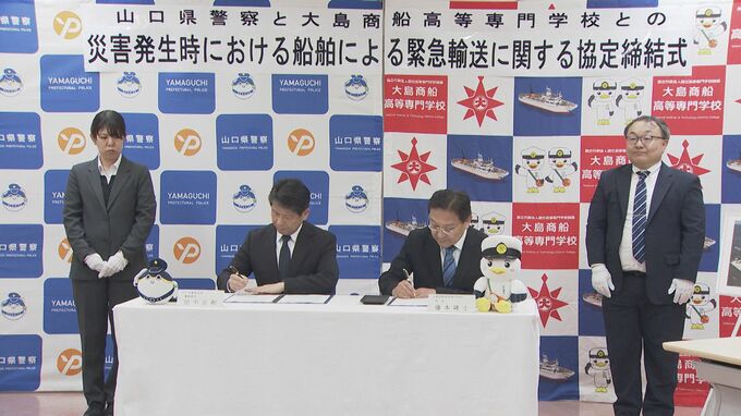 全国で初めての取り組みです。10日、山口県警と大島商船高専が災害時に救助部隊や支援物資を運ぶため、練習用の船を活用する連携協定を結びました。