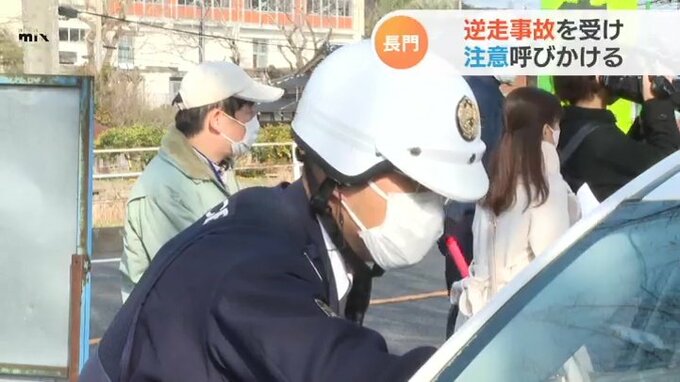 長門市の自動車専用道路で逆走による事故が発生したのを受け、警察官がドライバーに注意を呼びかけました。事故が発生した長門市深川湯本の山陰道長門・俵山道路近くのパーキングエリアで、警察官5人がドライバーにチラシなどを配り、逆走防止を呼びかけました。