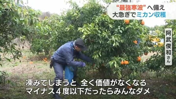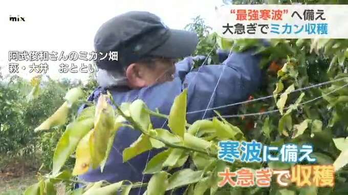 萩市大井にある阿武俊和さんのミカン畑では、寒波に備えて大急ぎで収穫をしました。寒波で気温が氷点下になる予想で、果実が凍るおそれがあります。