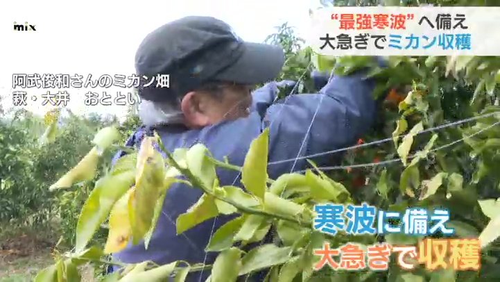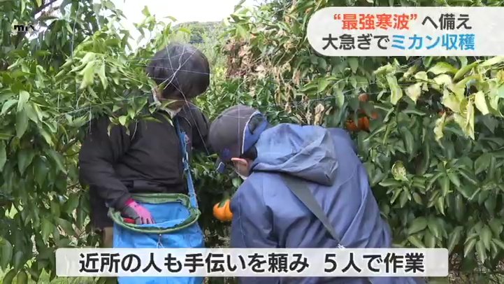 萩市大井にある阿武俊和さんのミカン畑では、寒波に備えて大急ぎで収穫をしました。寒波で気温が氷点下になる予想で、果実が凍るおそれがあります。