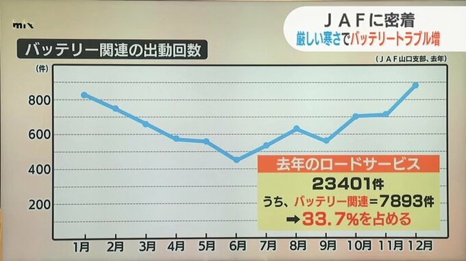 24日から26日午後0時半にかけての、バッテリー関連でのJAF山口支部の出動は39件でした。バッテリーに関するJAF山口支部の出動回数を月別にグラフにまとめてみると…1月や12月など、冬に多いのが一目で分かります。